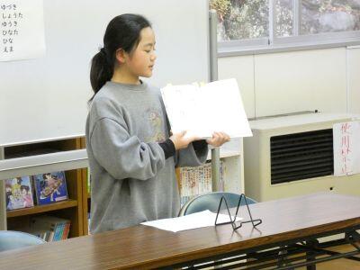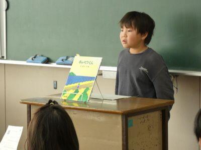 決勝戦では、全校の前で本の紹介をしました。なるべく原稿を見ることなく、顔をあげ、聞いている人に語り掛けるように話していました。